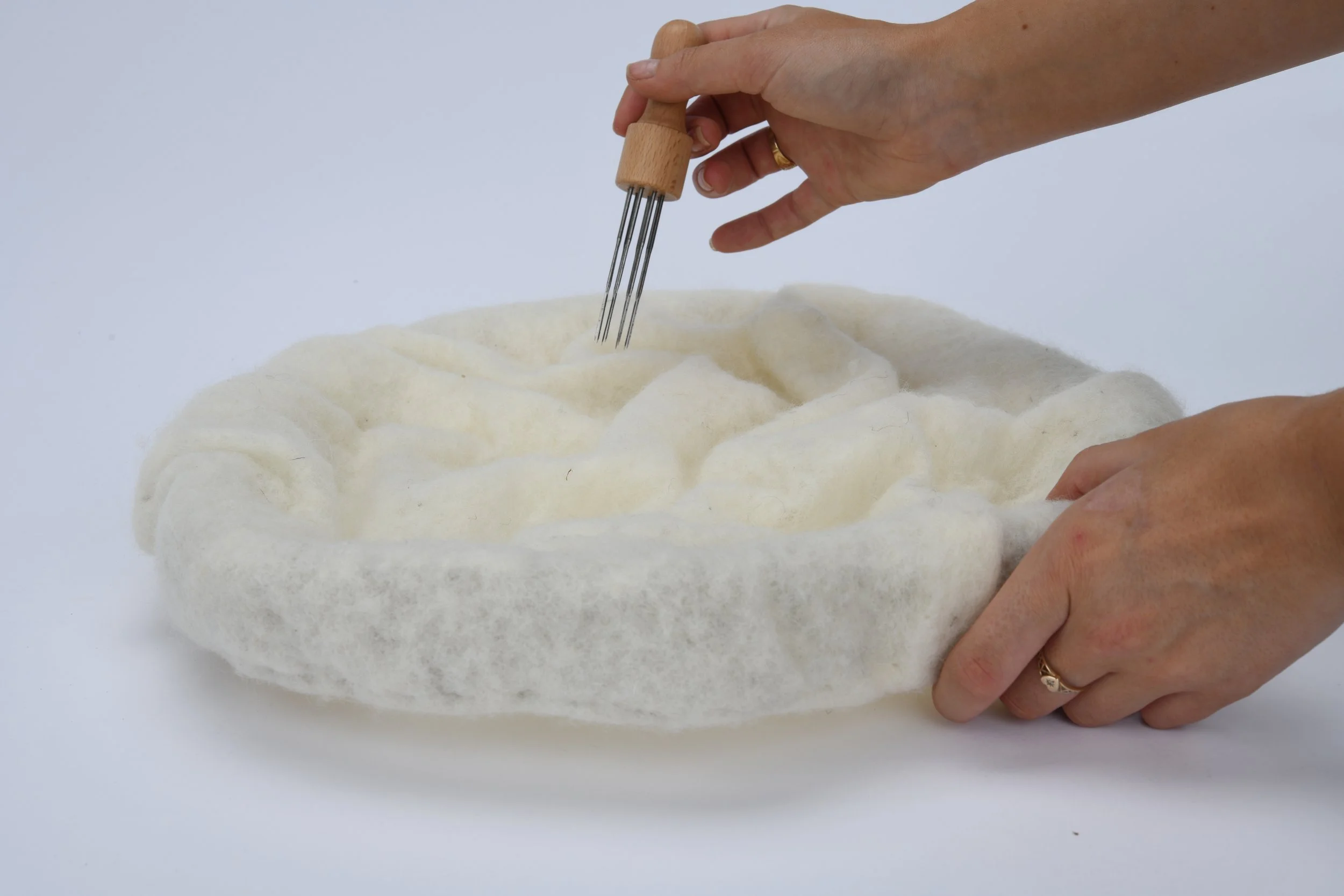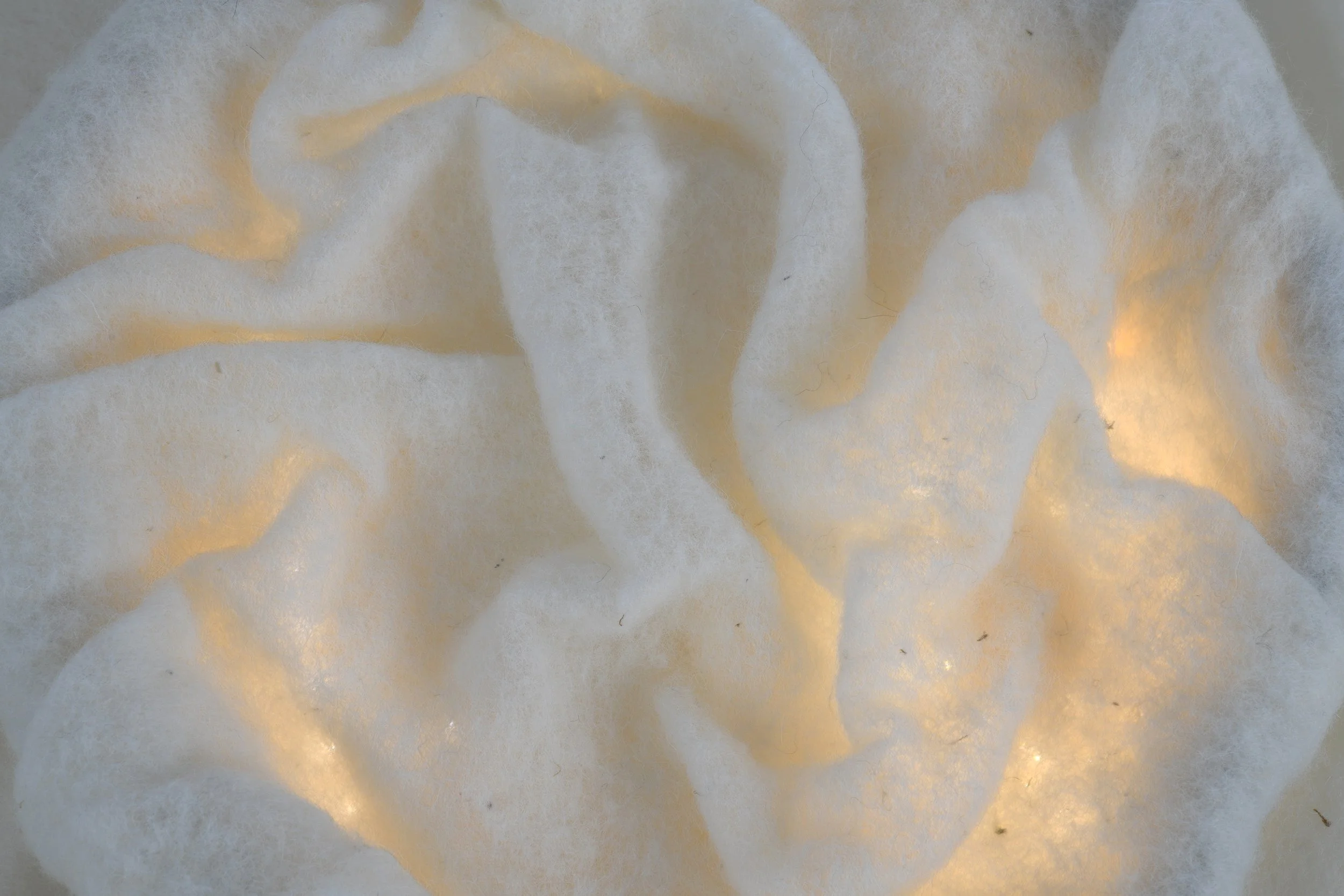 My intrigue in learning a new material led me to testing wool felting. With the aim of discovering what the possibilities are with a single material without the addition of any other materials. This also led to testing the light permeability of the material and considering how it can be used in lighting applications.